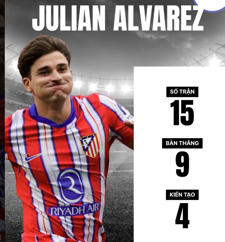 Ngôi sao người Argentina đang trải qua quãng thời gian thăng hoa tại sân Wanda Metropolitano kể từ khi gia nhập Atletico Madrid từ Manchester City vào năm 2024. Anh đã ghi được 9 bàn thắng và có 4 pha kiến tạo sau 15 lần ra sân trên mọi đấu trường mùa này, phong độ ấn tượng khiến anh trở thành một trong những tiền đạo được săn đón nhất châu Âu.